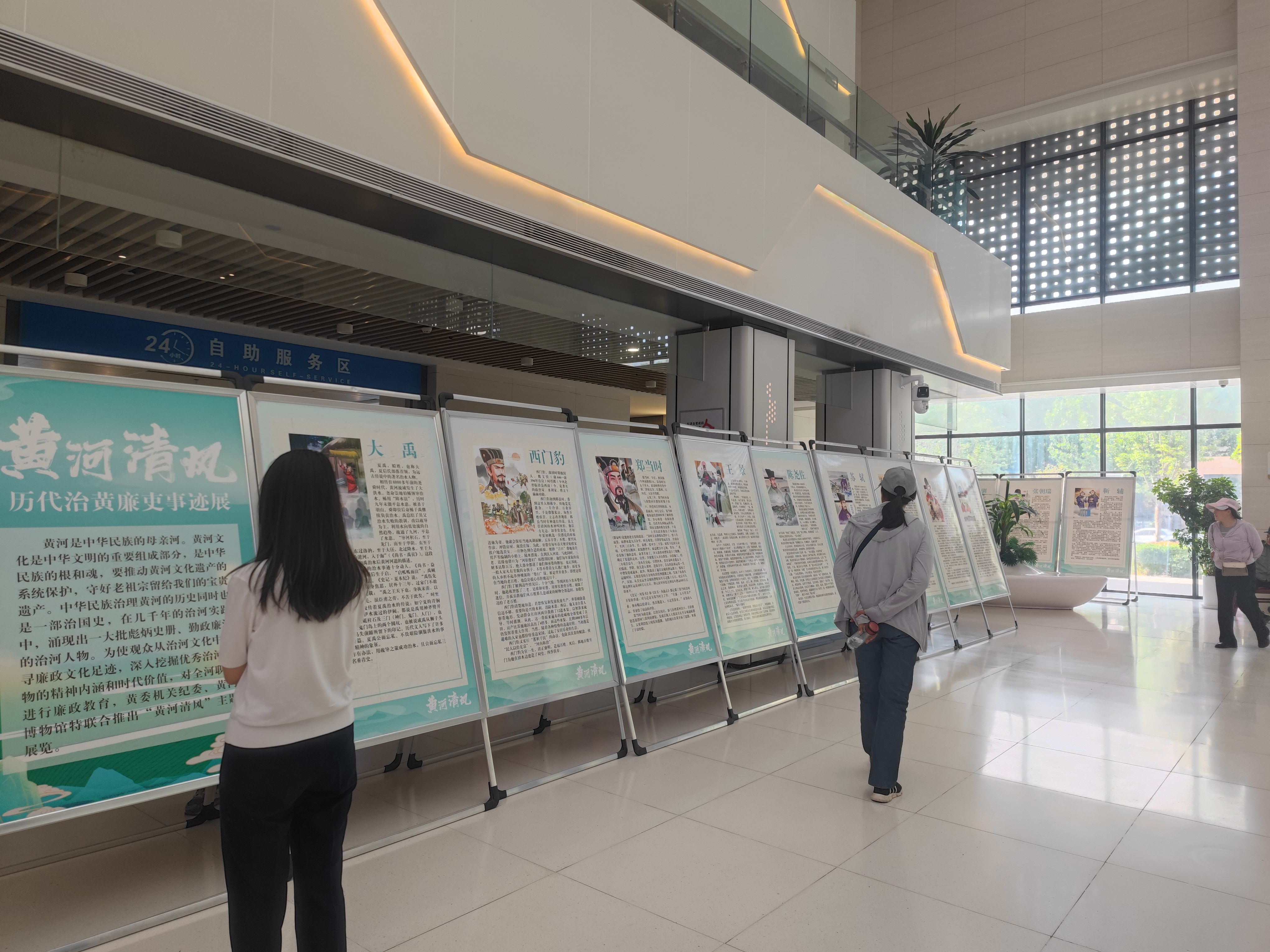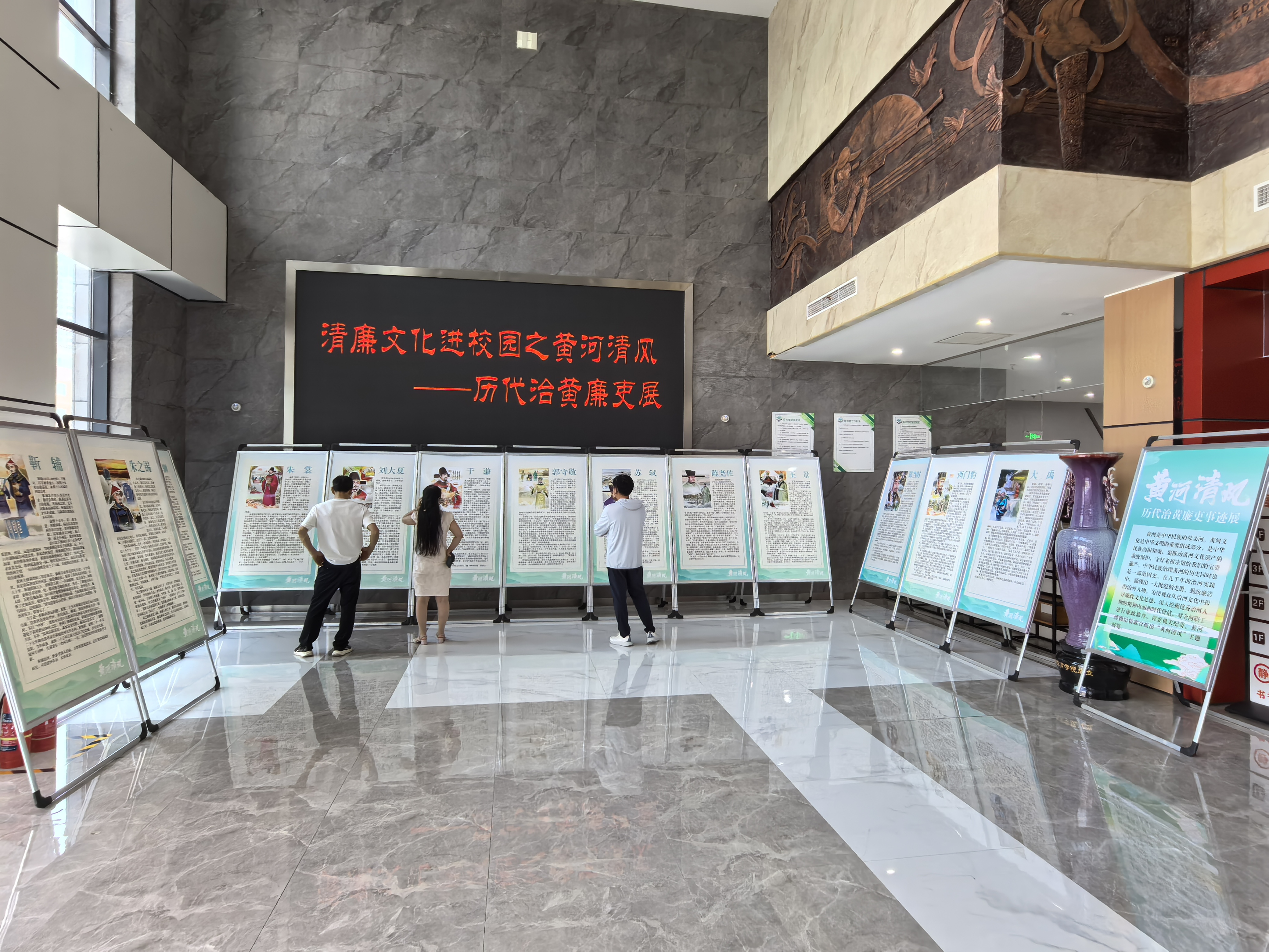 携“黄河清风—历代治黄廉吏展”走进郑州市惠济区政务大厅和河南省体育学院。通过历史名臣如西门豹、于谦、林则徐、靳辅等治黄廉吏的勤政事迹,传递“以水喻廉”的廉政文化,助力新时代廉洁文化建设。