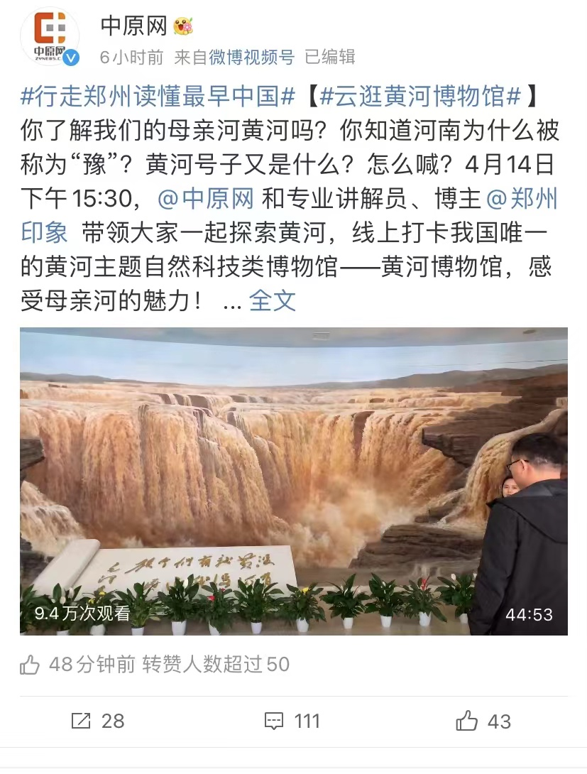你了解“母亲河”黄河吗?河南为什么被称为“豫”?黄河号子是什么,应该怎么喊?4月14日下午,中原网直播邀请微博大V@郑州印象与专业讲解员一起线上打卡我国唯一的黄河主题自然科技类博物馆——黄河博物馆,一起揭开了这些问题的答案,感受母亲河的魅力!