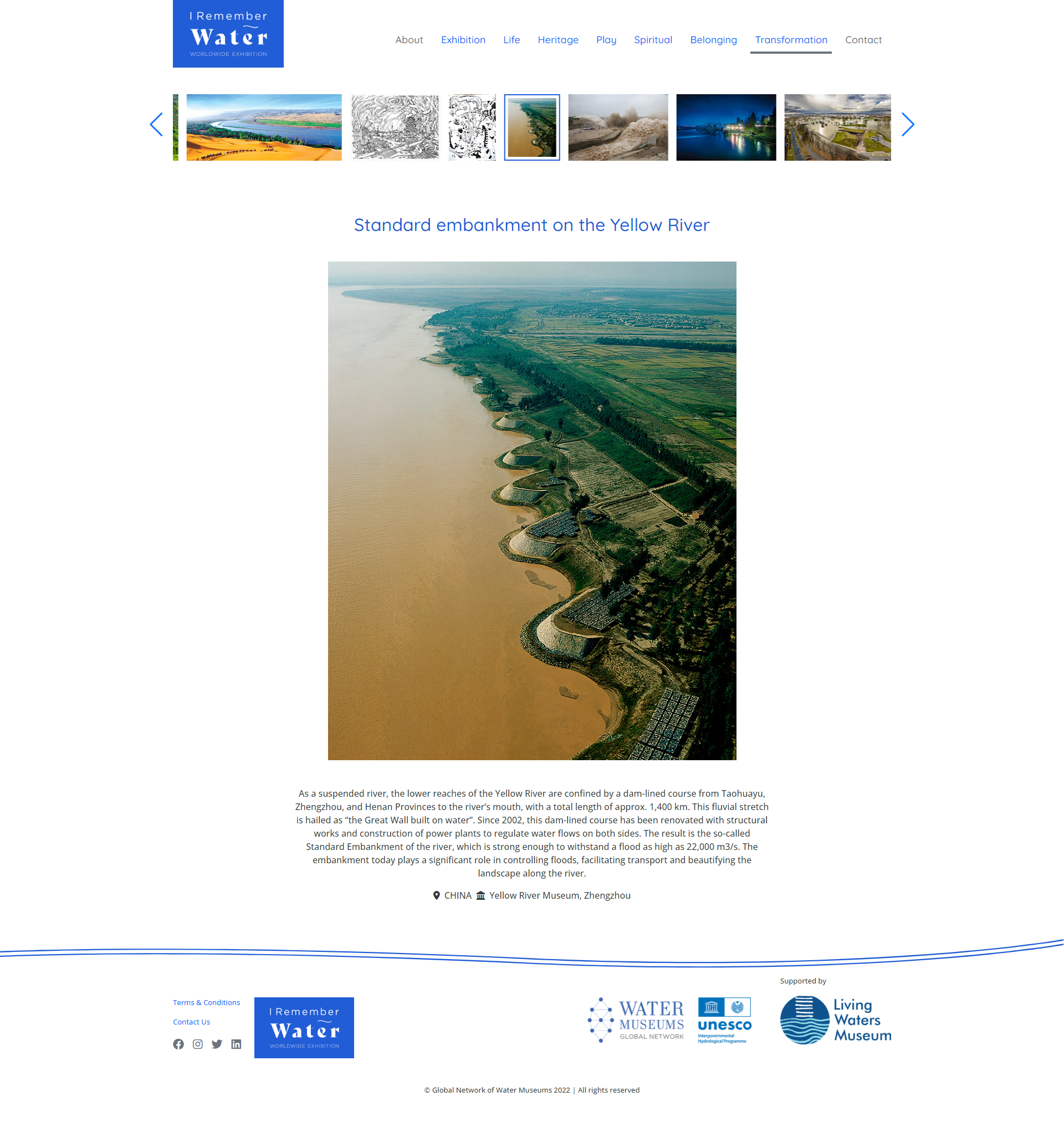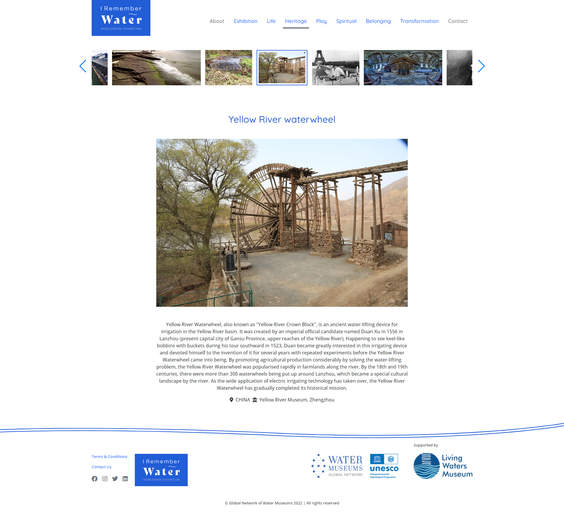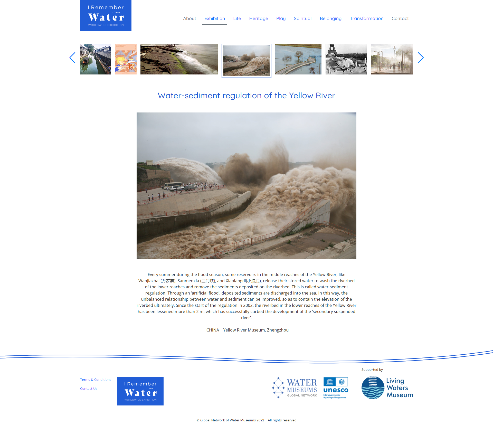 本次线上数字展览以“我的水记忆(I Remember Water)”为题,面向WAMU-NET会员单位征集可以唤起人们对过去水资源的回忆并且探索有助于塑造未来水资源途径的摄影或其他图像作品。展览旨在通过展示各个水博物馆的藏品来探寻人类与水资源关系的记忆,总共包含WAMU-NET旗下近70家会员单位报送的462件作品,分为“生命之源(LIFE)”“宝贵遗产(HERITAGE)”“人水互动(PLAY)”“精神指引(SPIRITUAL)”“水域归属(BELONGING)”和“水源转化(TRANSFORMATION)”六个部分,着重展现了人类由于水资源而触发的一系列情绪,如快乐,挣扎,生死,欢庆,尊重,神圣等。黄河博物馆报送的参展作品《黄河水车》及《调水调沙》《标准化堤防工程》分别入选了“宝贵遗产(HERITAGE)”与“水源转化(TRANSFORMATION)”两个单元。