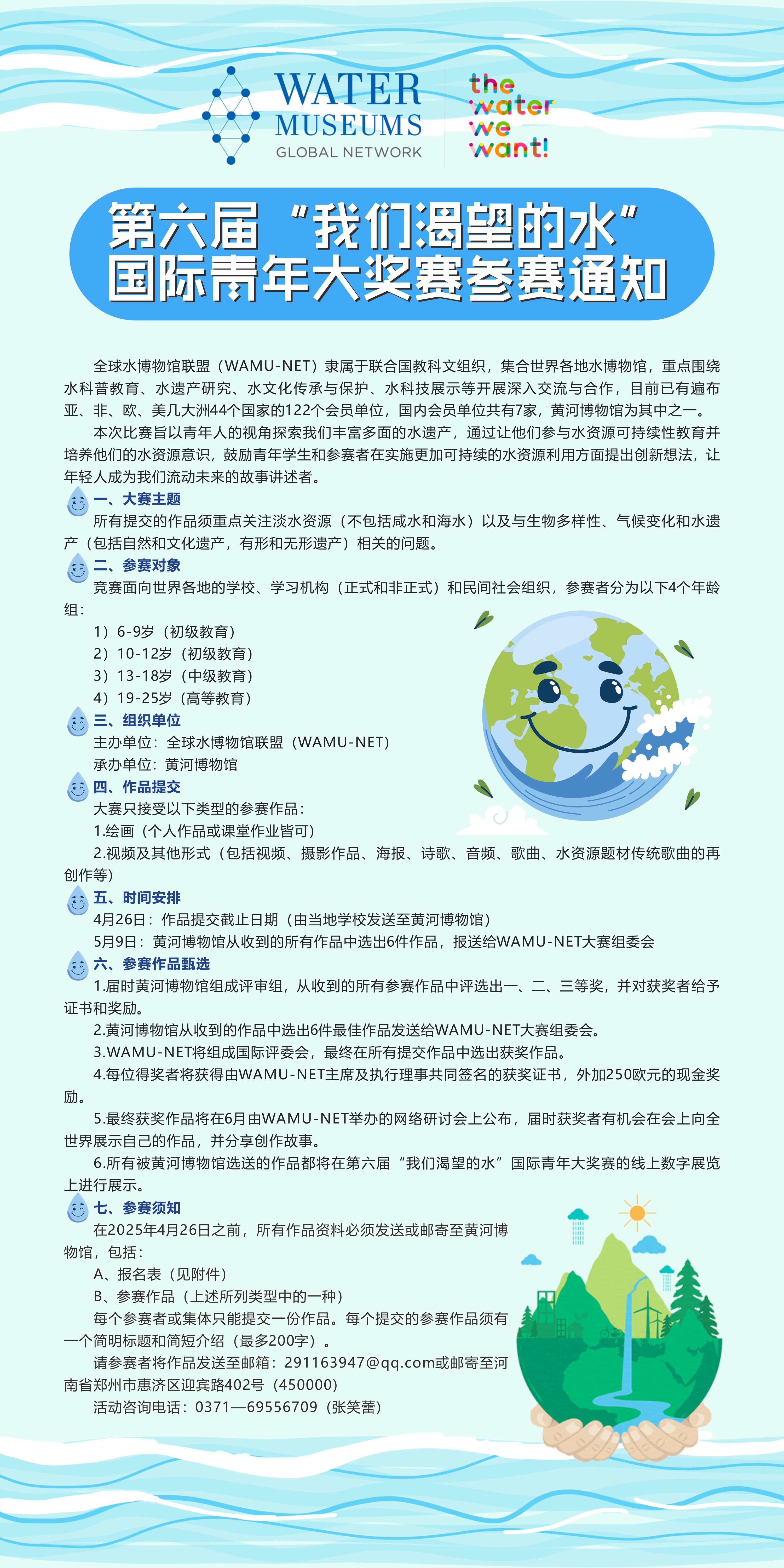 6.所有被黄河博物馆选送的作品都将在第六届“我们渴望的水”国际青年大奖赛的线上数字展览上进行展示。